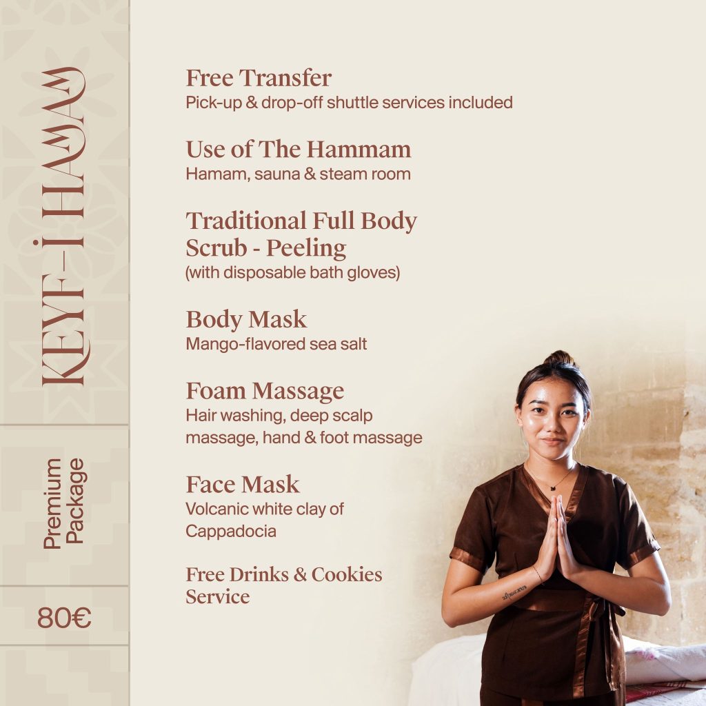 EXCELLENT Based on 1119 reviews Posted on JC BMTrustindex verifies that the original source of the review is Google. Una experiencia inolvidable. Atención y servicio muy bueno, muy limpio. Recomendable para relajarse del día a día. Te ofrecen bebida al finalizar la sesiones .GraciasPosted on Elena BlascoTrustindex verifies that the original source of the review is Google. Vine con mi familia, nos encantó la experiencia. El personal fue super agradable y sin duda repetiríamosPosted on Ester BiancoTrustindex verifies that the original source of the review is Google. This place is amazing, one of the best experiences.Posted on Gaetan BerubeTrustindex verifies that the original source of the review is Google. The best place in town!Posted on Elif Kırcaalıç GülnermanTrustindex verifies that the original source of the review is Google. Bir ay içerisinde üç kere gidip çok keyif aldığımız bir yer tertemiz bir mekan çalışan bayan inanılmaz derecede ilgili Aloya hanımdı galiba, Suyu ücretsiz sodayı ücretsiz veriyorlar hiçbir mekan bu kadar mütevazi olamazdı herkesin gitmesi gerekli olan bir yer diye düşünüyorum hamam sefasını seven herkes değerlendirmeli.Posted on Sara SpillerTrustindex verifies that the original source of the review is Google. The stuff is very kind and professional, and the location is clean and beautiful. Thanks you for the experience!!Posted on Jim BejnaTrustindex verifies that the original source of the review is Google. Absolutely fantastic experience. The staff was exceptional, the atmosphere great! We did the 90 minute Sultan package. My wife and I were in the same room and it was wonderful! I highly recommend washing away the dust and achy muscles after a few days of exploring Cappadocia!Posted on Anne-Laure VandersmissenTrustindex verifies that the original source of the review is Google. We chose the basic program (60€) and it was amazing! The sessions are a complete experience and the massage is the perfect balance between a relaxing and dynamic one. Employees are really kind, we definitely recommend this place!